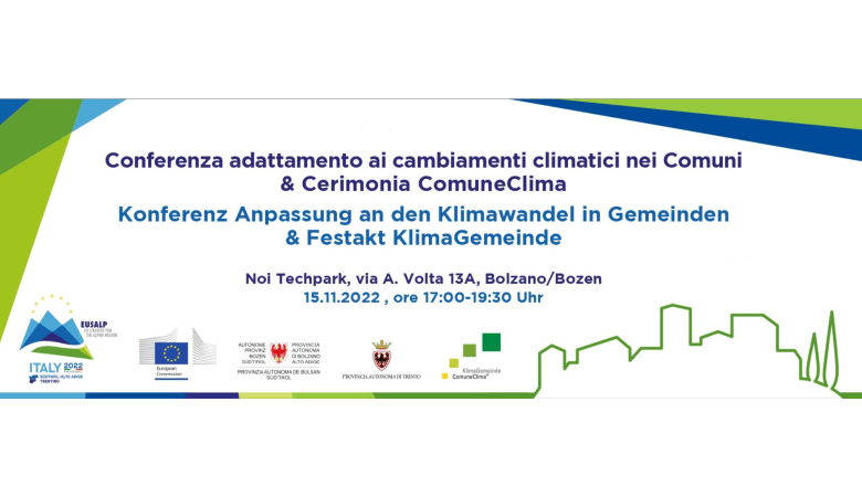 Per Alto Adige ed il Trentino si chiude l'anno di Presidenza della Strategia dell’Unione Europea per la Regione Alpina (EUSALP). Il passaggio di consegne alla Svizzera si svolgerà il 24 novembre a Trento. Prima di ciò, l’Eusalp invita, in collaborazione con l'Agenzia CasaClima, alla conferenza sul tema “Adattamento ai cambiamenti climatici nei Comuni” che si svolgerà