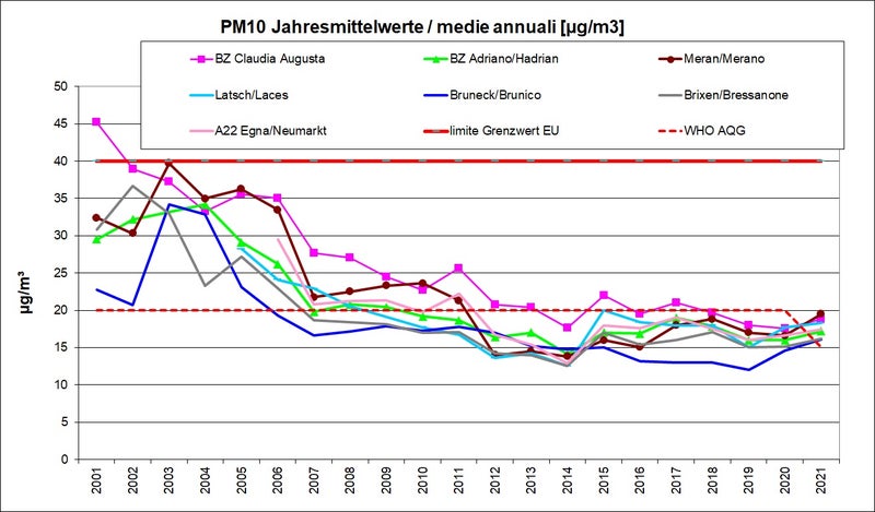 “Le polveri fini (PM10 e PM2,5), sono di origine in parte naturale in parte antropica (riscaldamento, industrie, traffico, fenomeni di attrito su strada, ecc.). La situazione in Alto Adige nel 2021 è rimasta sostanzialmente invariata rispetto al 2020 - spiega ancora Luca Verdi. Vengono ampiamente rispettati i limiti imposti dalle norme europee in termini di medie annuali. Per il PM10, distribuito in modo piuttosto omogeneo sul territorio, le medie annuali sono comprese in tutti i punti di misura fra 16 e 20 microgrammi/m3 (a fronte di un limite di 40 microgrammi/m3). Per il PM2,5 l’intervallo che comprende tutti i valori medi annuali è 11-14 microgrammi/m3 (a fronte di un limite di 20 microgrammi/m3).