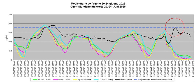 Con l'aumento delle temperature e dell'irraggiamento solare, negli ultimi giorni sono aumentate le concentrazioni di ozono. Il 23 giugno, alle ore 22, nella stazione di misurazione Selva Verde sul Renon (Ritten-Grünwald) è stata superata la soglia informativa di 180 microgrammi per metro cubo. Il valore medio orario era pari a 182 microgrammi per metro cubo (µg/m³).