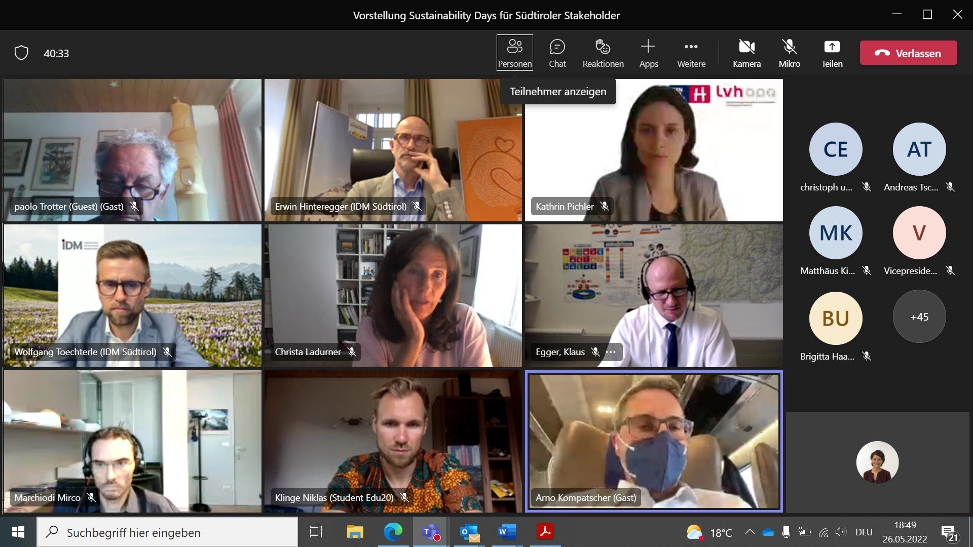 - Il presidente della Provincia, Arno Kompatscher, e il direttore generale di IDM, Erwin Hinteregger, hanno informato numerosi rappresentanti di gruppi d'interesse economici, sociali, ambientali e culturali in merito alla piattaforma "Sustainability Days 2022" (Foto: ASP) » [IMG 360 kB]